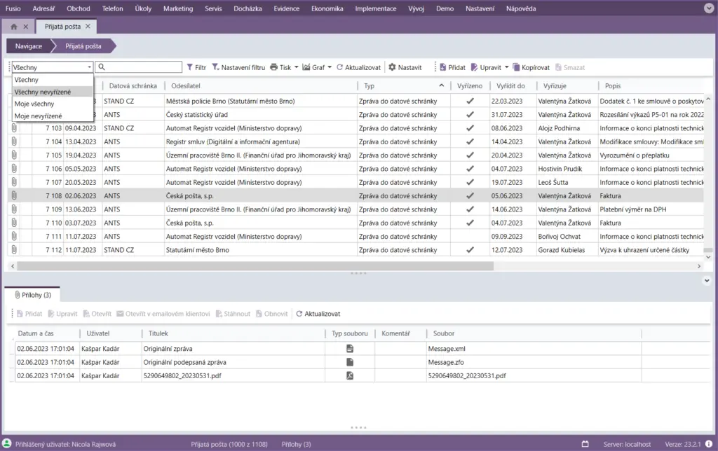 Ukázka evidence zpráv z datových schránek a následné zpracování a workflow ve Fusio.