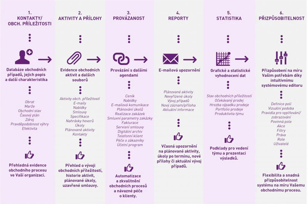 - Evidencia obchodných príležitostí, kontaktov a príloh.
